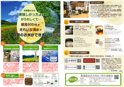 日本人の主食である「米」がおいしいのは当たり前。でも安心・安全なのか?私たち内日三町生産組合は、長年培ってきた豊富な経験と知識を活かし,ありきたりな言葉でも、人と地球にやさしいお米作りを、次を担う子供たちに誇れる